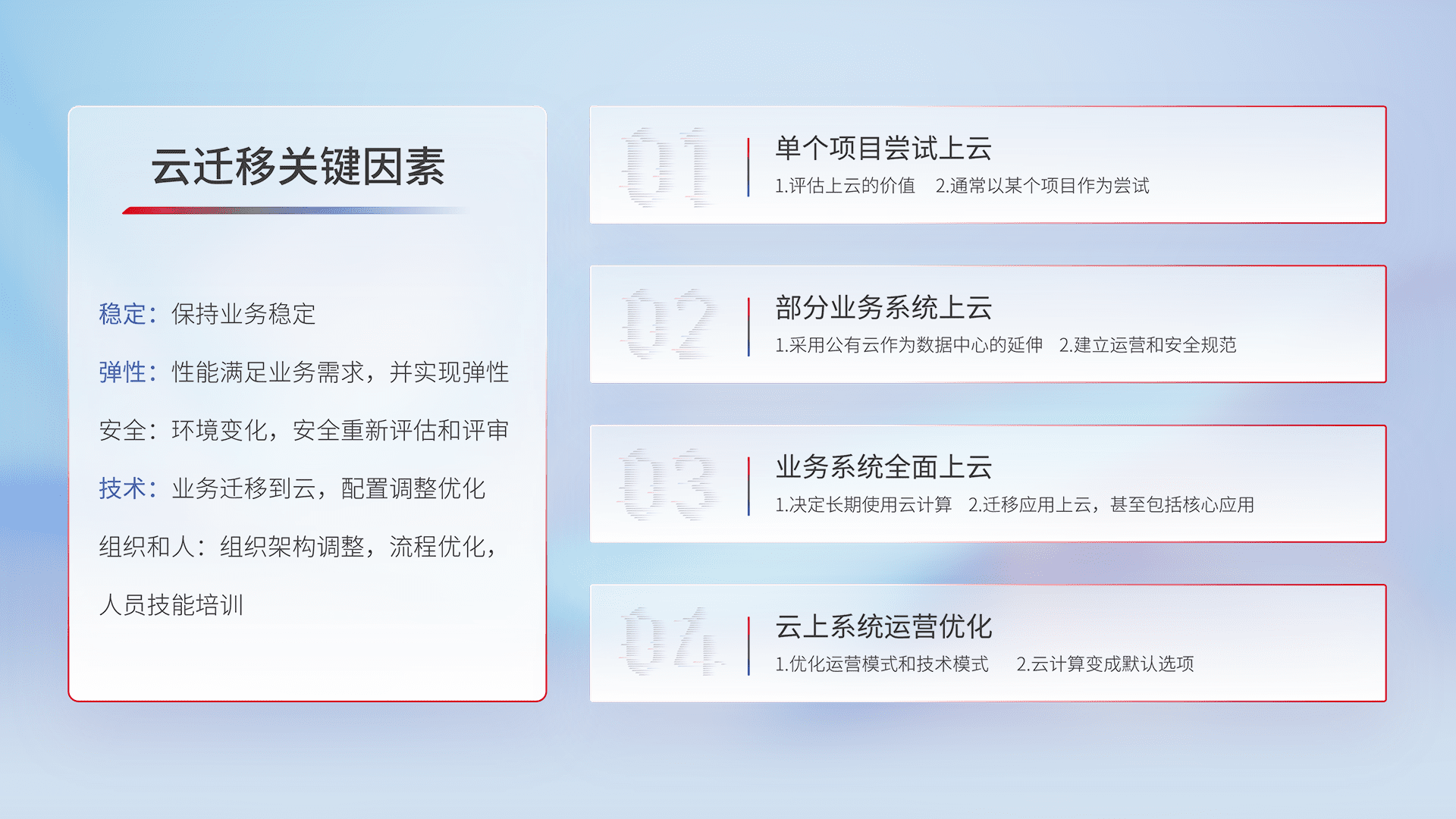 结合实际业务,,,,从规划设计、、、云平台选型、、、云原生改造、、、、数据迁移、、、集成交付,,,迁移全过程为客户识别最佳上云路径,,做好风险识别管理,,,,设计网络架构、、、身份权限、、、安全审计合规、、操作审计、、日志审计、、监控告警策略、、多站点容灾设计等,,对云上基础设施进行整体规划,,,,提升IT治理水平,,,,以满足弹性、、高可用、、、高性能的需求。。