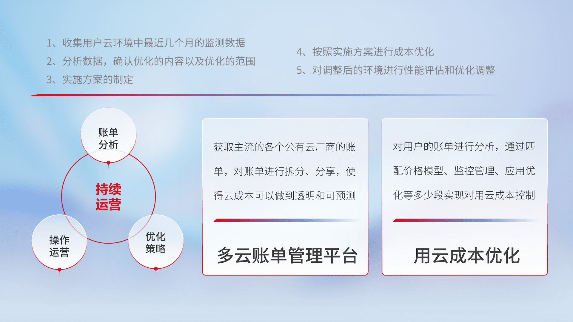 通过多云纳管,,,,以统一的资源数据模型把客户的云资源进行抽象和封装,,,,进而实现对多云资源的统一操作,,,,保障云资源管理的可靠性、、、稳定性与可用性。。。量身定制化运维内容,,,,配置、、、开发运维、、补丁管理、、备份、、、监控、、、认证和访问管理、、审计和日常巡检等,,,,保障在用云过程中的可靠度,,,稳定度以及高可用率。。