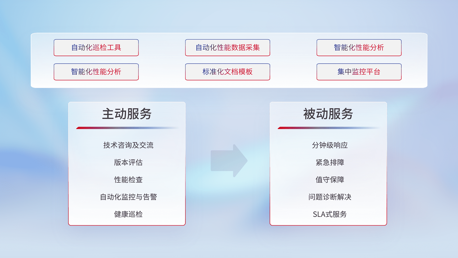 智能化工具和标准化文档,,,,保障服务质量,,,提供主动服务(包含技术咨询、、版本评估、、、性能检查、、、自动化监控与告警、、健康巡检)和被动服务包含(分钟级响应、、、紧急排障、、、、值守保障、、、问题诊断解决、、、SLA服务)。。